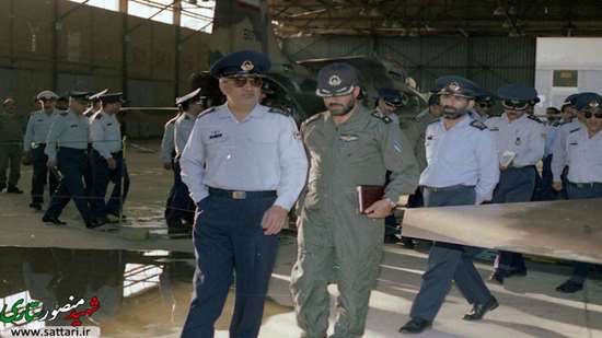 «شهید منصور ستاری، تیمسار بقایی فرمانده منطقه هوایی دزفول (با لباس خلبانی) و شهید اردستانی پشت سر او در پایگاه هوایی دزفول.»